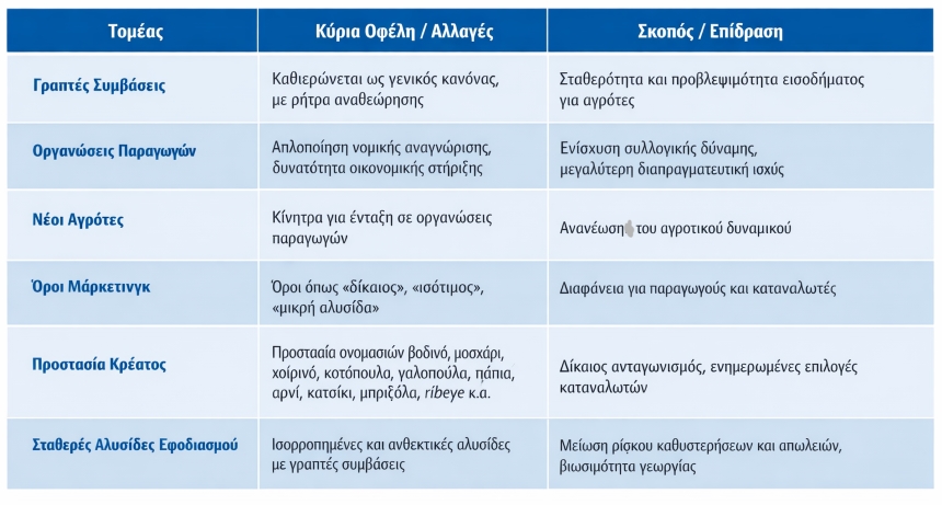 • Καθιερώνει γραπτές συμβάσεις μεταξύ αγροτών και αγοραστών, με ρήτρες αναθεώρησης για τις διακυμάνσεις αγοράς και κόστους.