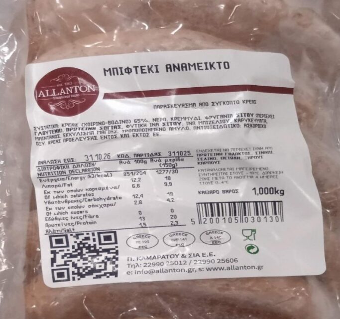 Ο ΕΦΕΤ, μέσω της Περιφερειακής Διεύθυνσης Πελοποννήσου, προχώρησε σε έλεγχο τροφίμων στο πλαίσιο του προγράμματος για την ασφάλεια των τροφίμων. Στη διαδικασία δειγματοληψίας εντοπίστηκε σε κατεψυγμένο μπιφτέκι, με κωδικό παρτίδας 31102025 και ημερομηνία ανάλωσης έως 31/10/2026, η παρουσία του επικίνδυνου μικροοργανισμού Salmonella spp. Το προϊόν παράγεται από την εταιρεία Π. Καμαράτου & Σία Ε.Ε. και η ανάλυση πραγματοποιήθηκε στο Εργαστήριο Δοκιμών & Ερευνών Τροφίμων Αθήνας του ΕΦΕΤ.
