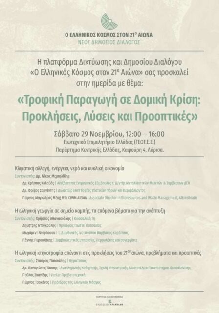 Η ελληνική αγροδιατροφή περνά μια κρίσιμη περίοδο και στο πλαίσιο αυτό, η πλατφόρμα «Ο Ελληνικός Κόσμος στον 21ο Αιώνα» διοργανώνει ημερίδα με τίτλο «Τροφική Παραγωγή σε Δομική Κρίση: Προκλήσεις, Λύσεις και Προοπτικές». Η εκδήλωση θα γίνει το Σάββατο 29 Νοεμβρίου, από τις 12:00 έως τις 16:00, στο Παράρτημα Κεντρικής Ελλάδας του ΓΕΩΤ.Ε.Ε. στη Λάρισα (Καψούρη 4) και στοχεύει να αναδείξει τα χρόνια προβλήματα του πρωτογενούς τομέα, φέρνοντας στο ίδιο τραπέζι επιστήμονες, παραγωγούς και φορείς.