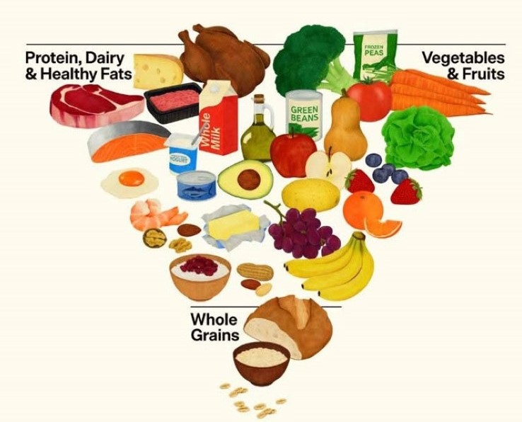 Οι οδηγίες προτείνουν κρέας, αβγά, γαλακτοκομικά πλήρους λιπαρότητας, καθώς και ελαιόλαδο, βούτυρο ή ζωικό λίπος στο μαγείρεμα, αντί για σπορέλαια. Παράλληλα, δίνεται έμφαση στην κατανάλωση ολόκληρων και μη επεξεργασμένων τροφίμων.