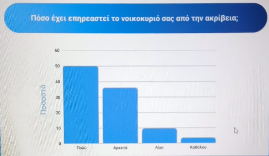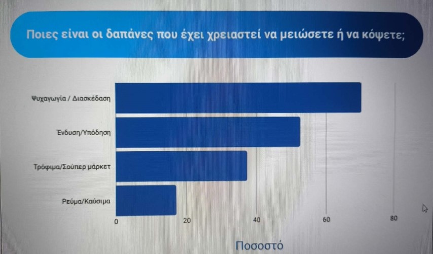 Πάνω από 8 στους 10 πολίτες λένε ότι η άνοδος των τιμών τους έχει επηρεάσει πολύ ή αρκετά, ενώ το 74% παραδέχεται πως η αγοραστική του δύναμη έχει μειωθεί τα τελευταία δύο χρόνια. Σχεδόν 8 στους 10 έχουν κόψει έξοδα, ακόμη και σε τρόφιμα, ρεύμα και υγεία.