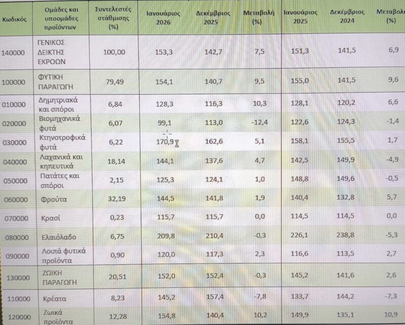 Σύμφωνα με τα στοιχεία της ΕΛΣΤΑΤ, ο Γενικός Δείκτης Τιμών Εκροών στη γεωργία και την κτηνοτροφία – δηλαδή οι τιμές που λαμβάνουν οι παραγωγοί για τα προϊόντα τους – παρουσίασε αύξηση 1,3% τον Ιανουάριο του 2026 σε σύγκριση με τον ίδιο μήνα του 2025.