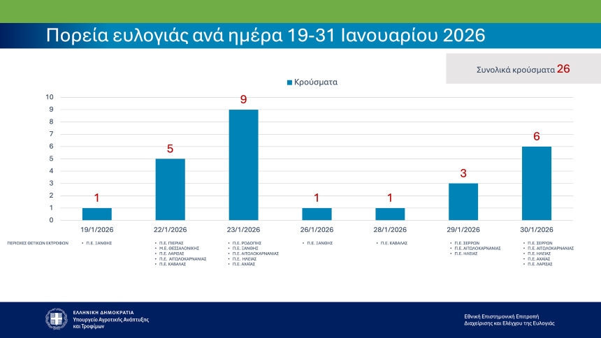 Τα νέα περιστατικά στο διάστημα 19–31 Ιανουαρίου 2026 εντοπίστηκαν στις εξής περιοχές: