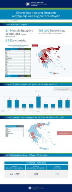 Παράλληλα, συνεχίζονται εντατικά οι έλεγχοι της Ελληνικής Αστυνομίας για την εφαρμογή των μέτρων και την αποτροπή παράνομων μετακινήσεων. Για το διάστημα 14/10/2025 – 29/03/2026 έχουν πραγματοποιηθεί 47.592 έλεγχοι, έχουν βεβαιωθεί 89 παραβάσεις και έχουν γίνει 88 συλλήψεις.